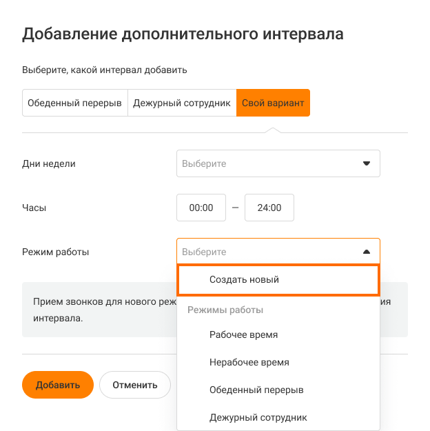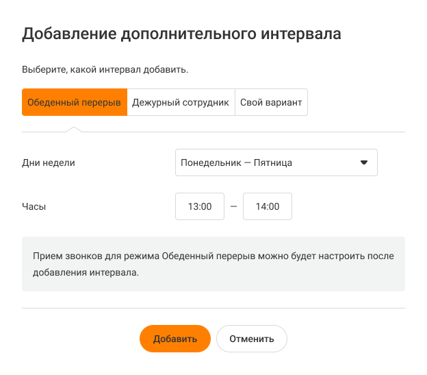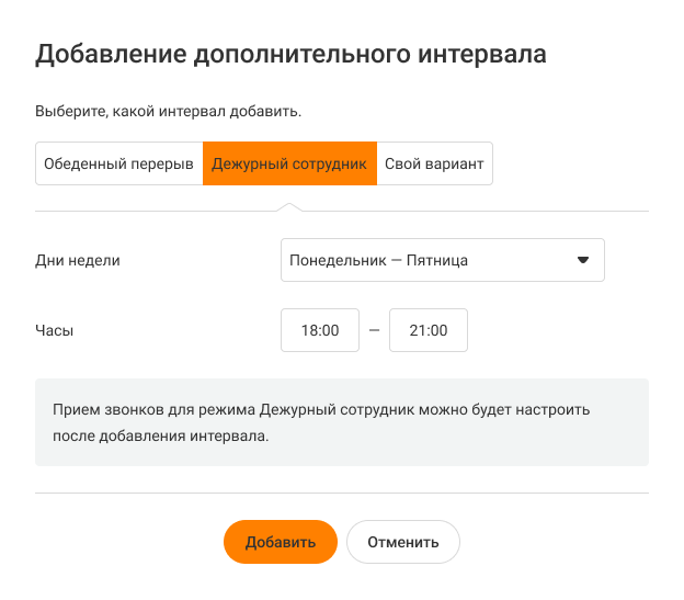 Если работа в вашей компании организована сложнее и для создания корректного расписания вам недостаточно указать время обеденного перерыва и дежурства, вы можете создать собственный дополнительный интервал и настроить для него правила обработки входящих. Своих дополнительных интервалов может быть сколько угодно.