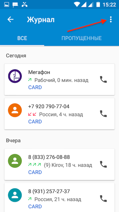 1. Зайдите в «Журнал звонков» и откройте параметры вызовов (три точки в правом верхнем углу).