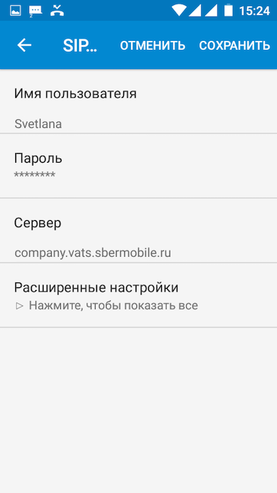 6. Введите имя пользователя, пароль и адрес сервера из настроек сотрудника в Виртуальной АТС.