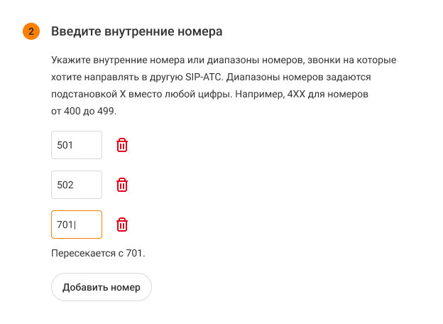 4. Укажите внутренние номера подключаемой АТС или их диапазоны, чтобы Виртуальная АТС знала, какие звонки нужно отправлять в подключаемую АТС. Количество номеров и диапазонов неограниченно.