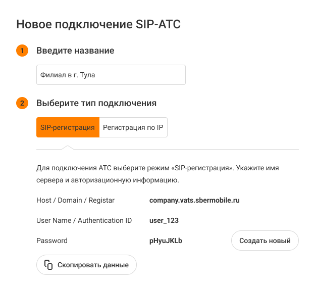 Если вы хотите подключить SIP-АТС по «SIP-регистрации», останьтесь на той же вкладке, скопируйте настройки SIP-подключения (сервер, логин и пароль), пропишите их на стороне вашей SIP-АТС и нажмите «Применить».
