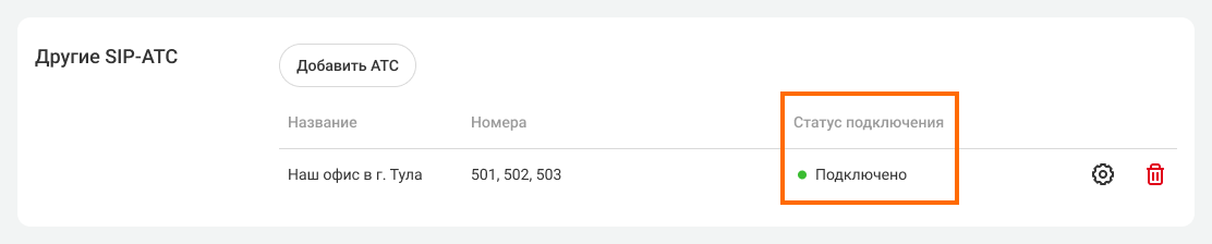 После того как настройки будут произведены, статус подключения SIP-АТС в личном кабинете Виртуальной АТС изменится на «Подключено» и будет отмечен зеленым индикатором. Это значит, что теперь вам доступны звонки по коротким номерам между пользователями ВАТС и подключенной SIP-АТС.
