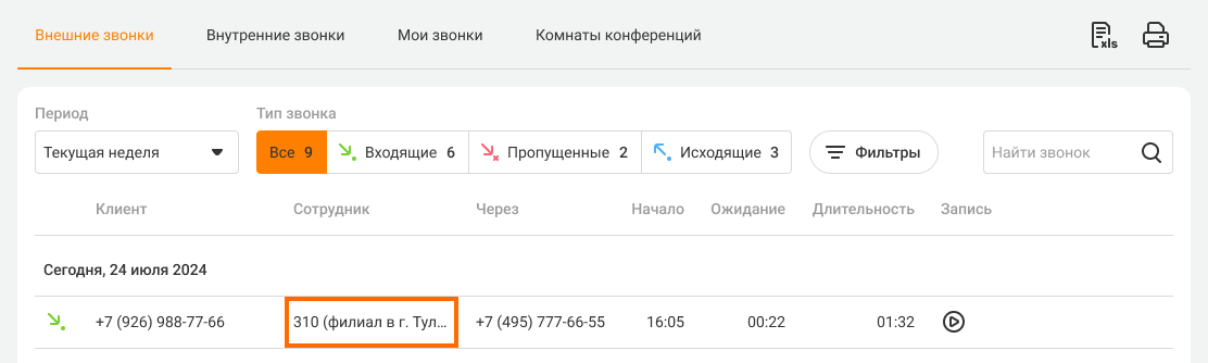 При звонках сотрудников из других АТС, добавленных в отделы вашей ВАТС, по умолчанию будет подставляться основной номер компании. Чтобы настроить подстановку региональных и персональных номеров, обратитесь в поддержку.