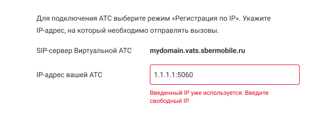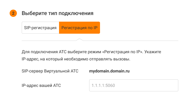 Если вы хотите подключить SIP-АТС по SIP-транку, выберите тип подключения «Регистрация по IP» и укажите IP-адрес подключаемой АТС в формате 1.1.1.1:5060.