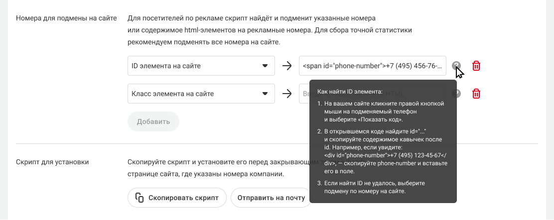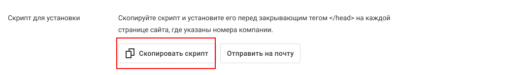 Скопируйте код для подбора номеров и установите его перед закрывающим тегом </head> на каждой странице, где требуется подбор номера. Для этого нажмите на кнопку «Скопировать код». Это поможет своевременно узнавать о возникновении ошибок в работе коллтрекинга.