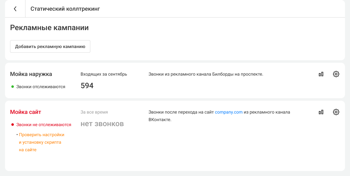 Рекомендуем заходить в список рекламных кампаний для проверки статуса коллтрекинга хотя бы раз в неделю.