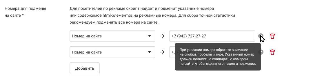 В нашем примере не подменился один из номеров. Чтобы исправить ошибку, мы копируем номер с сайта и вставляем его в настройки коллтрекинга.