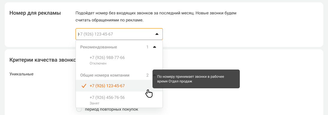 Вверху списка будут отображаться номера, на которые звонки не поступали в течение месяца. Мы рекомендуем использовать именно такие номера для коллтрекинга — это поможет получить более точную статистику по рекламе. Но, в целом, вы можете выбрать любой другой свободный номер. Если номер уже используется в другой рекламной кампании под ним будет указан статус «Занят».