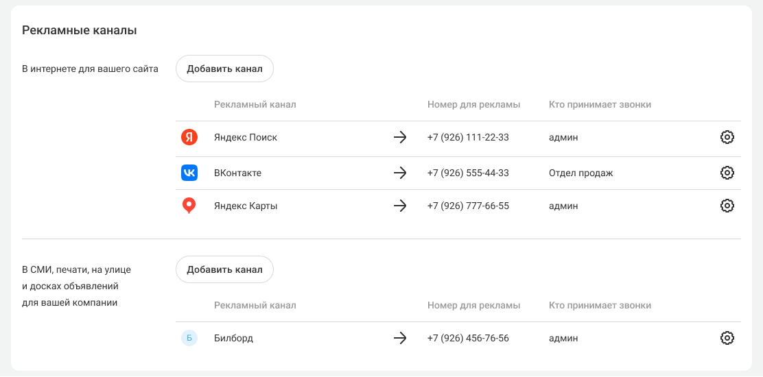 • с разделением по рекламным каналам через несколько номеров — для одновременного запуска рекламы через несколько каналов.