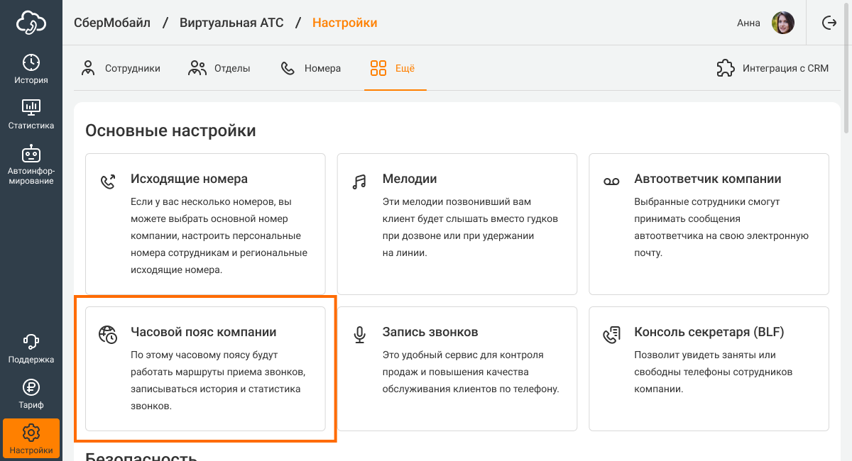 1. В настройках вашей Виртуальной АТС перейдите в раздел «Еще» и выберите раздел «Часовой пояс компании».
