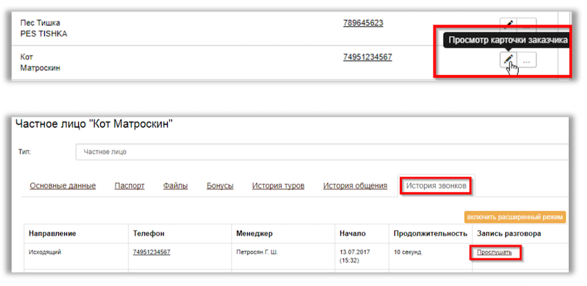 Если пользователь совершал или принимал звонки с закрытой U-ON Travel в браузере, то история звонков этого пользователя запишется в U-ON Travel не сразу. История звонков появится в U-ON Travel в тот момент, когда этот пользователь вновь откроет U-ON Travel в браузере на своем рабочем компьютере.Историю звонков можно посмотреть на странице карточки Заказчика в разделе «Заказчики / туристы». Если ваша АТС поддерживает функцию аудиозаписи телефонных разговоров, то вы сможете прослушать запись, щелкнув по ссылке «Прослушать» рядом с нужным событием: