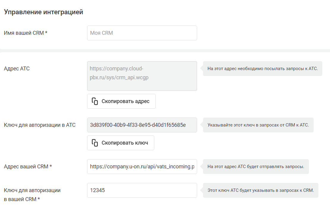 Скопируйте «Адрес АТС», «Ключ для авторизации в АТС» и «Ключ для авторизации в вашей CRM» из Виртуальной АТС и укажите их в системе U-ON.Travel, в разделе «Настройки — Интеграция телефонии».