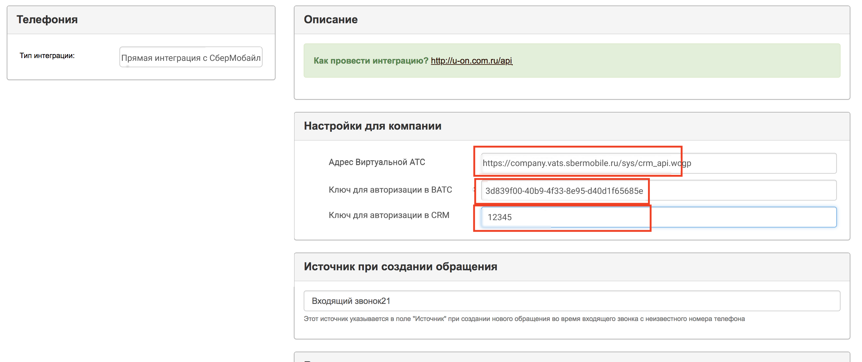 • Адрес вашей CRM: укажите адрес в формате: https://[ваш поддомен].u-on.ru/api/vats_incoming.php