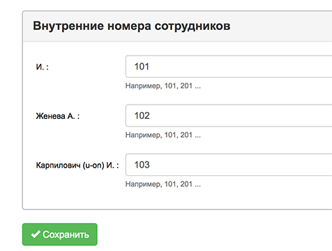 Укажите внутренние номера сотрудников точно так же, как у вас они указаны в Виртуальной АТС.